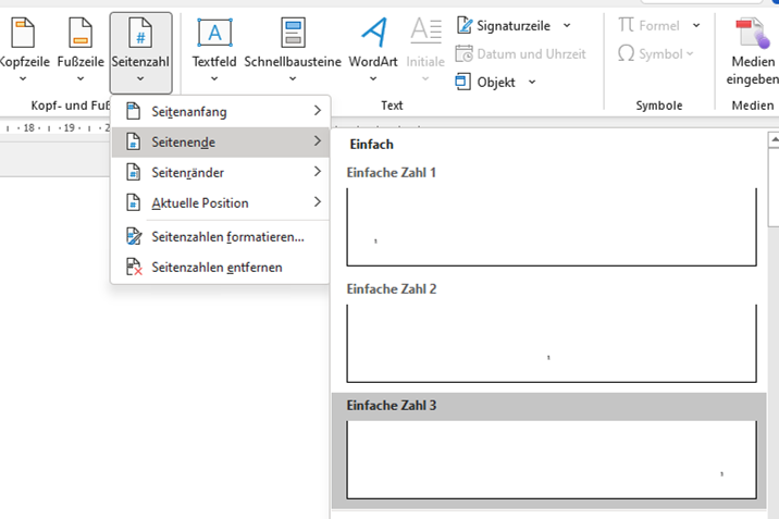 Klicke im Menü EINFÜGEN unter „Kopf und Fußzeile“ auf „Seitenzahl > Seitenende > Einfache Zahl 3„.